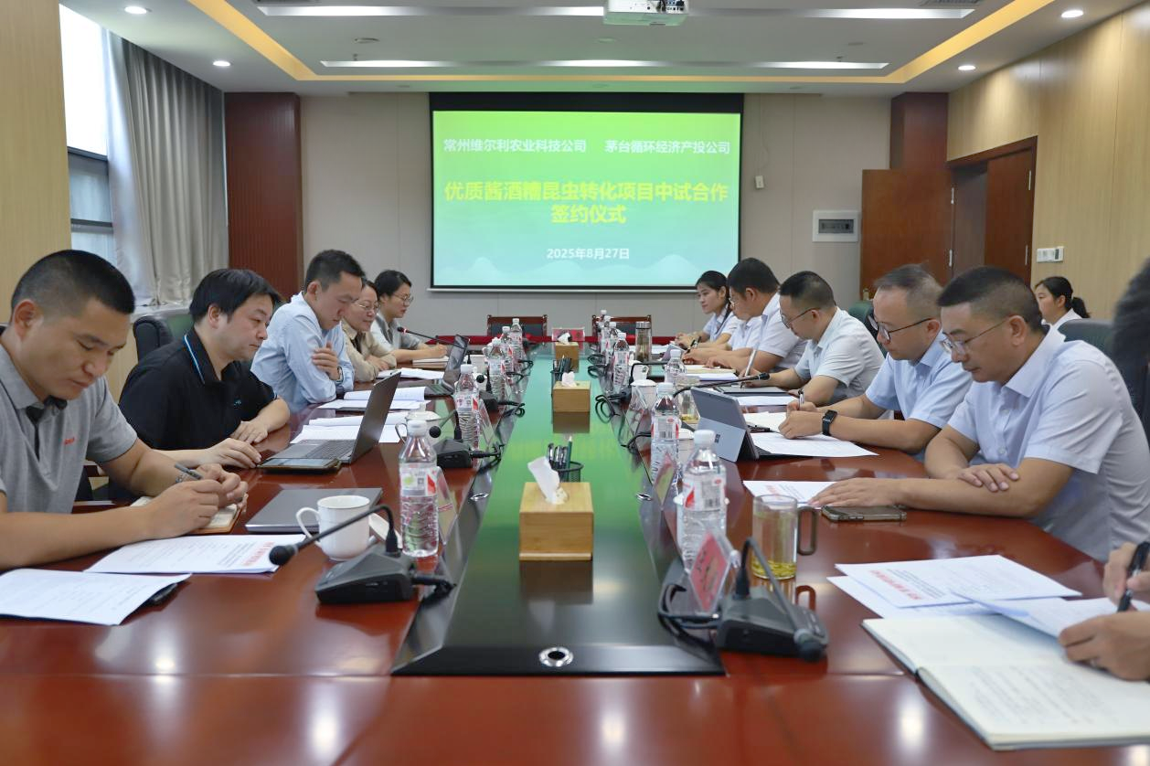 8月27日上午,ag尊龙链接集团旗下常州ag尊龙链接农业科技发展有限公司(下称“ag尊龙链接农业”)与贵州茅台酒厂 (集团) 循环经济产业投资开发有限公司(下称“茅台循环产投公司”)正式签署中试合作协议。双方将携手开展“优质酱酒糟黑水虻昆虫转化资源利用中试验证研究” 项目,打造“酱酒糟——昆虫蛋白——宠粮”产业链,共同探索酿酒副产物资源化利用的创新路径。