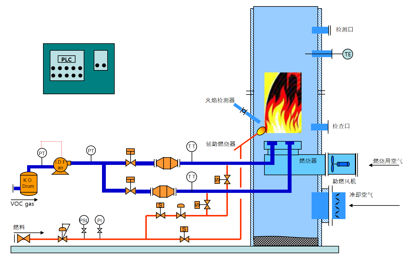 VCU设备是把产生的VOC气体引入到燃烧烟囱内在800~1000℃下完全燃烧之后,分解为无害、无臭的清洁气体排放到大气中的环境治理设备。